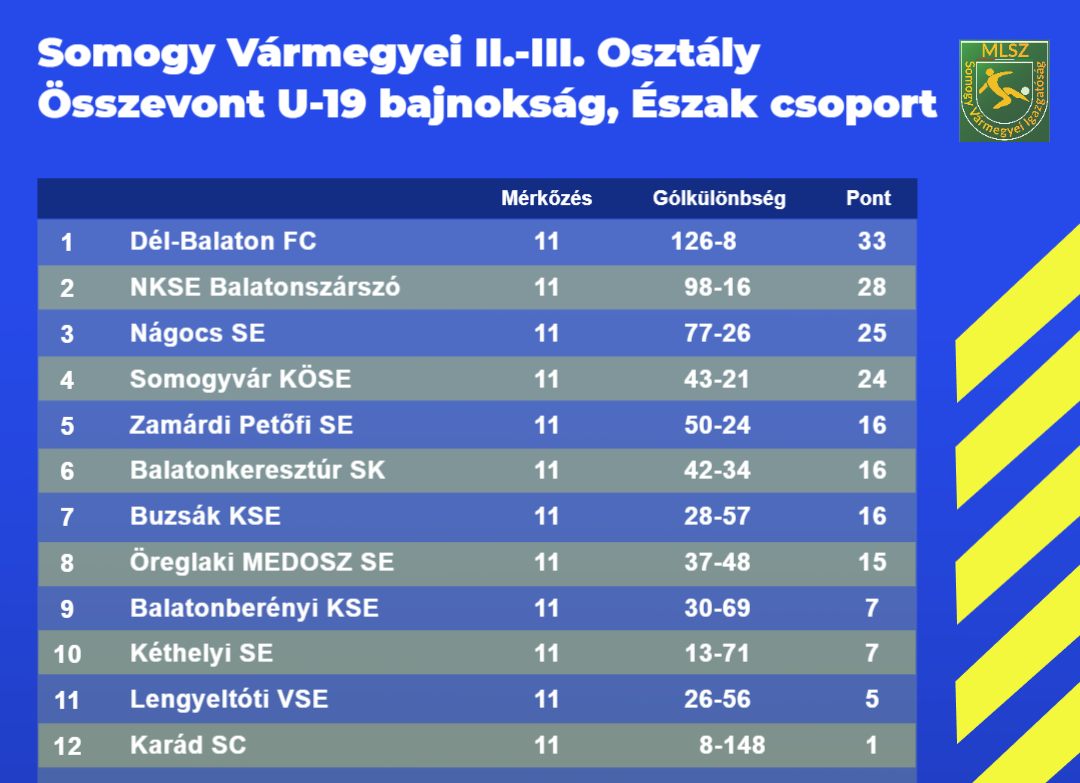 A téli időszakban sem pihennek az U-19-es játékosok, részt vesznek a Somogy Vármegyei U-19-es téli futsal tornán Balatonbogláron és több edzőmérkőzéssel készülnek a tavaszi idényre. A Somogy Vármegyei II.-III. osztályú U-19-es bajnokság Észak csoportja 2026. március 21.-én folytatódik, amikor Nágocson vendégszerepel majd a Pusztai Gábor edzette gárda.